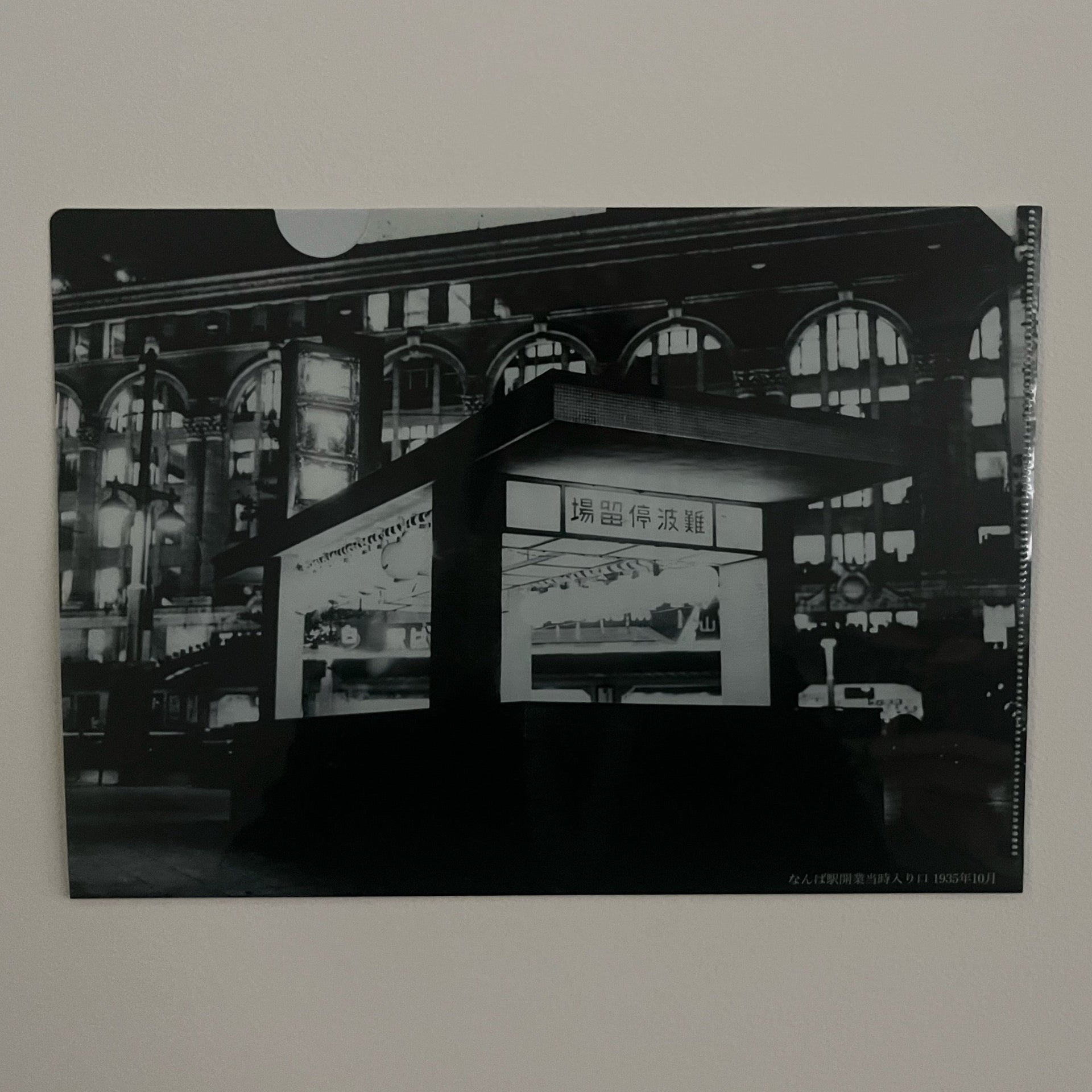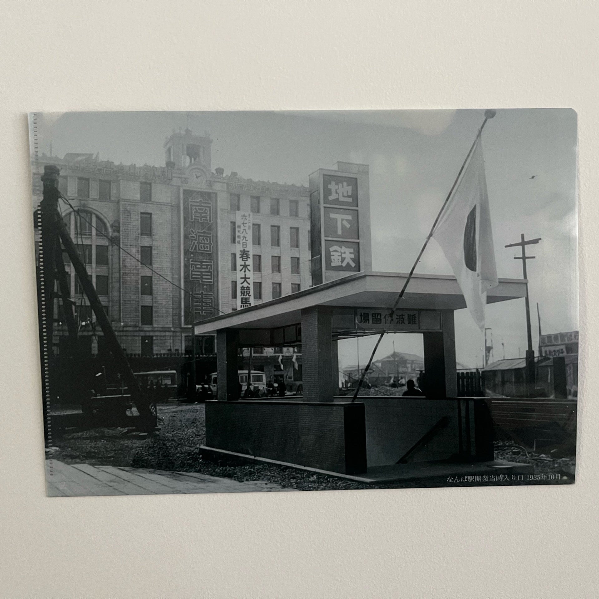 開通当時の貴重なポスターを使用したクリアファイル、開通当時の梅田駅構内写真を両面に使用したクリアファイル、開通当時のなんば駅写真を両面に使用したクリアファイルの3点セットです。